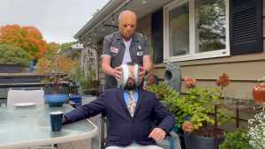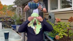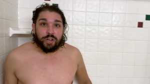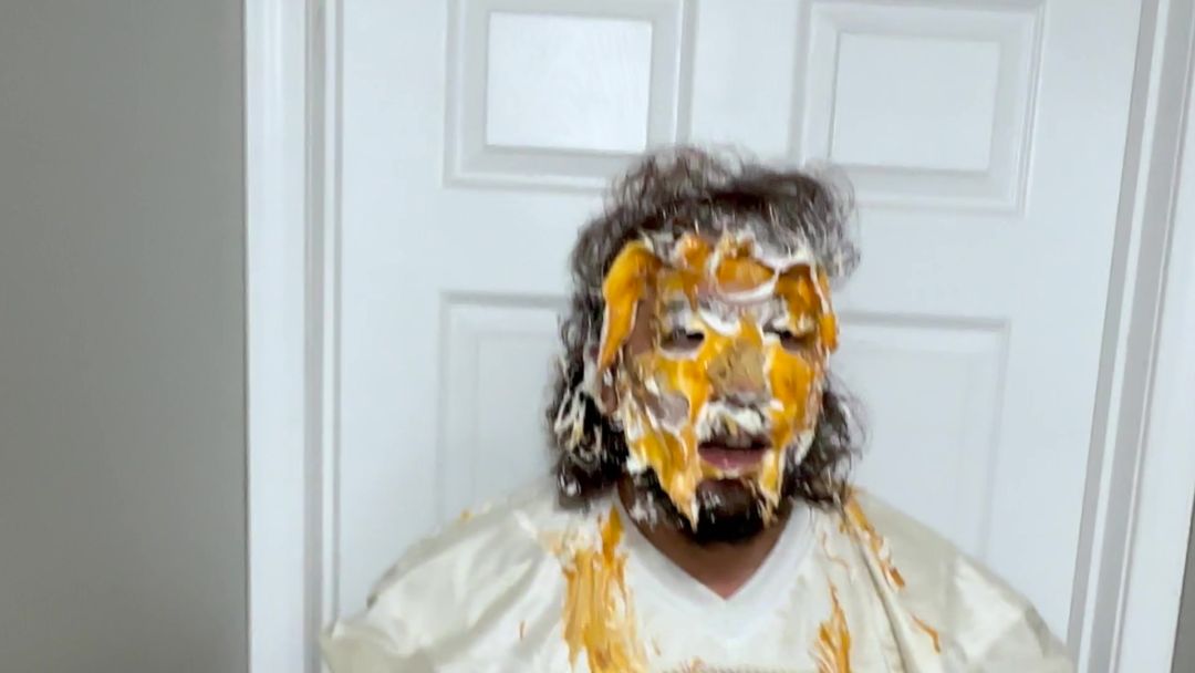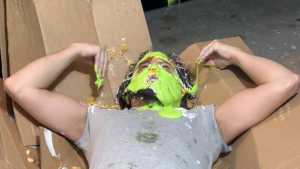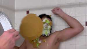 This thrilling new edition by Pieology starts in the shower; with three pies and a bottle of strawberry syrup. Then while working in the garage a Mechanic is pied and has green slime poured over his head. Looking for his dad; football jock is pied and chased to a dead end pie. Tough boy is annoyed by his dad while rummaging the fridge and hit with a pie in the face. Suited man is enjoying coffee when Jason pie sandwiches and dumps a bowl of slime. Hippy is enjoying a toke when attacked with two pies. Jason is revealed and hit with a pie.